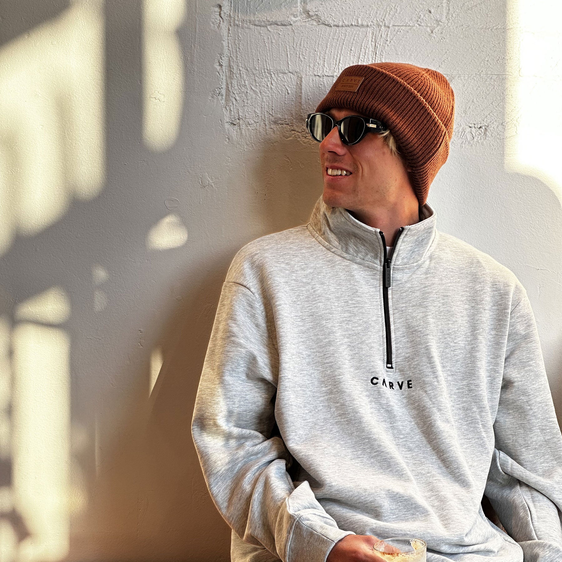 Men's 1/4 zip front, stand collar sweatshirt, front C A R V E embroidery and side front pockets.